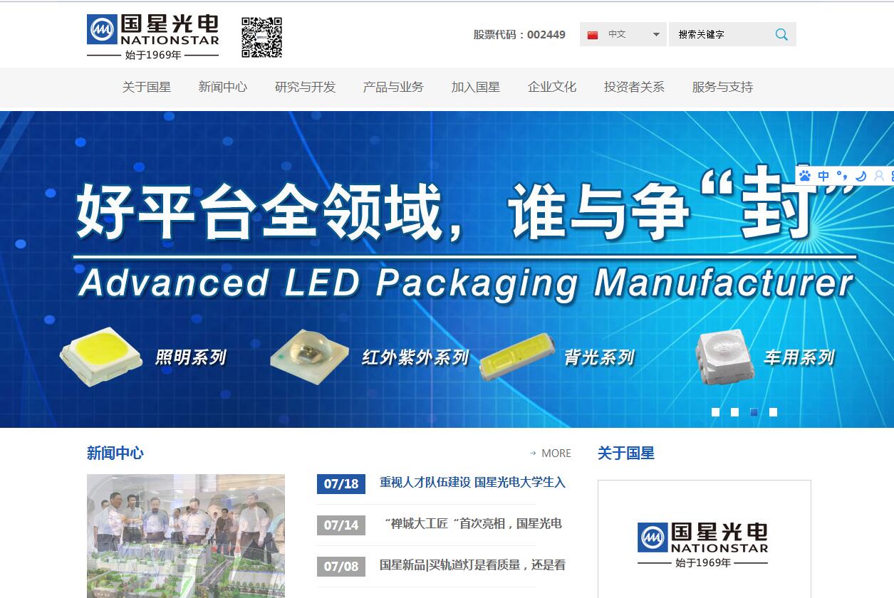 光電股份有限公司是廣東廣晟旗下專業(yè)從事研發(fā)、生產(chǎn)、銷售LED及LED應(yīng)用產(chǎn)品的國家高新技術(shù)企業(yè)、國家火炬計劃重點高新技術(shù)企業(yè)。公司占地面積9.26萬平方米,廠房面積19.9萬平方米。公司建于1969年,1976年開始涉足LED封裝,是國內(nèi)早生產(chǎn)LED的企業(yè)之一。經(jīng)過四十多年的發(fā)展,公司借助資金、技術(shù)、人才和管理等方面的優(yōu)勢為行業(yè)所認可。2014年,廣東省屬大型國有骨干企業(yè)廣晟資產(chǎn)經(jīng)營有限公司入資,國星光電成為混合所有制模式的實踐者。